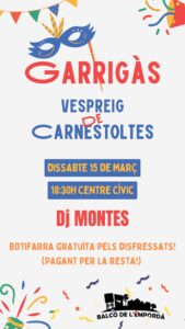 Dissabte 15 de març, a partir de les 18:30h, “Vespreig de Carnestoltes “ al Centre Cívic de Garrigàs, amb DJ Montes, organitzat per l’Associació Balcó de l’Empodà.